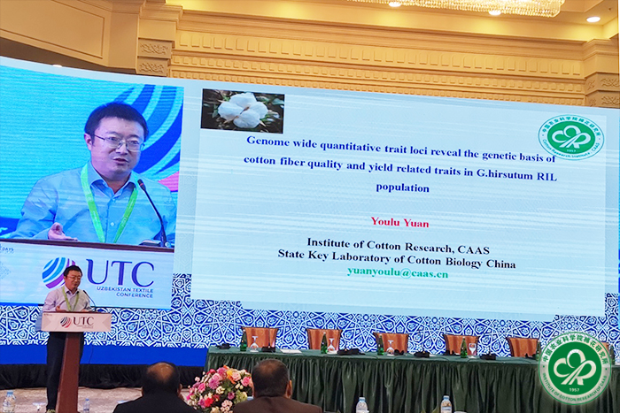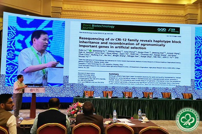 会上,我所叶武威研究员、袁友禄研究员分别作了题为“棉花甲基化基因家族全基因组鉴定及其在棉花遗传改良中的应用(Whole Genome Identification of Cotton Methylase Family Genes and its Utilization in Cotton Genetic Innovation)”“陆地棉全基因组QTL挖掘揭示了产量及品质性状的遗传关系(Genome-Wide Quantitative Trait Loci Reveal the Genetic Basis of Cotton Fiber Quality and Yield-Related Traits)”的大会报告,魏晓文副研究员提交论文“黄淮海棉区气候适应性变化研究”(Study on the Climate Suitability Change of Cotton in Huanghuaihai Area of China)做了展报(Poster),分别介绍了棉花甲基化家族全基因组分析及其抗旱耐盐种质创新、棉花产量纤维品质遗传研究和棉区气候适应性等最新研究进展,在大会交流中产生了广泛的影响。