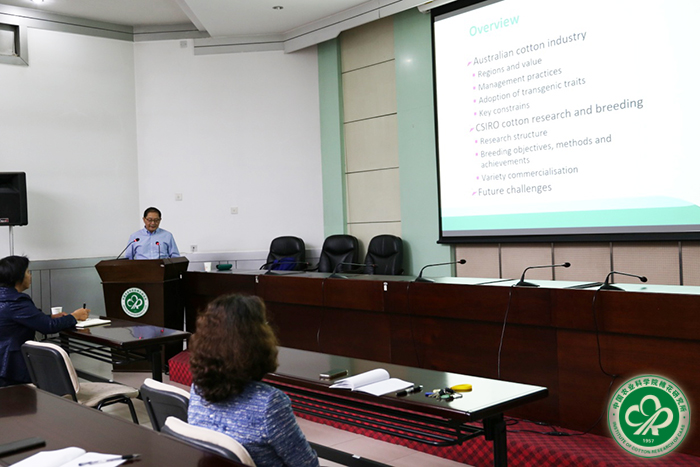 2019年10月8~12日,应星空体育·(中国)官方网站中早熟育课题组邀请,澳大利亚联邦科学与工业研究组织农业与食品部柳世铭博士来所参观访问并进行学术交流。   学术报告会上,柳世铭博士分别作了题为“澳大利亚棉花产业与育种现状及挑战(Status quo and challenges: Australian cotton industry and breeding)”和“澳大利亚棉花耐钠盐育种--降低叶片纳含量有利于棉花营养利用效率和产量的提升(Breeding for cotton sodicity tolerance in Australia - can leaf Na exclusion benefit to cotton NUE and yield )”的报告,概述了澳大利亚棉花生产概况、商业化现状及新品种培育情况,并结合自己近期的科研工作,讲解了棉花叶片钠离子含量对棉花营养吸收效率及产量的影响。报告会上,柳世铭博士与中棉所专家就棉花抗病虫育种和纤维品质改良相关问题进行了深入交流和探讨,为开展相关科研工作提供了参考。   此外,柳世铭博士听取了中早熟育种课题组成员的研究进展汇报,提出了指导性意见和建议,并与课题组成员就优质抗病虫性状的遗传改良进行了深入交流。   在所期间,柳世铭博士还参观了棉花生物学国家重点实验室、转基因实验室,国家棉花种质资源库等,对中棉所的科研条件及研究进展给予了高度肯定。   柳世铭博士,澳大利亚联邦科学与工业研究组织(CSIRO)农业与食品部研究科学家,棉花遗传育种专家。近十余年,培育和推广丰产优质抗病转基因抗虫抗草苷磷棉花品种10多个,累积推广面积达400多万公顷,直接让棉农增收8亿多澳元,每年为单位创收2千多万澳元;获国家级主席奖1项,省部级科技奖2项;多次出席国际、澳洲国内棉花研究和生产会议,作学术报告10余次;在BMC Plant Biol、PLOS ONE、Field Crops Research等国际知名期刊发表论文20多篇。(摄影:荆慧娟)