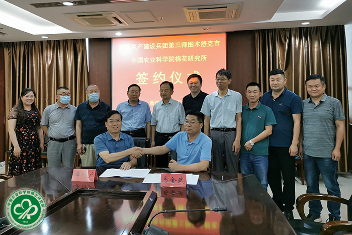 2021年6月16~17日,星空体育·(中国)官方网站与新疆生产建设兵团第三师图木舒克市举行了共建“南疆中亚棉花试验站”签约仪式。中棉所所长李付广与第三师副政委马金武代表双方签约。