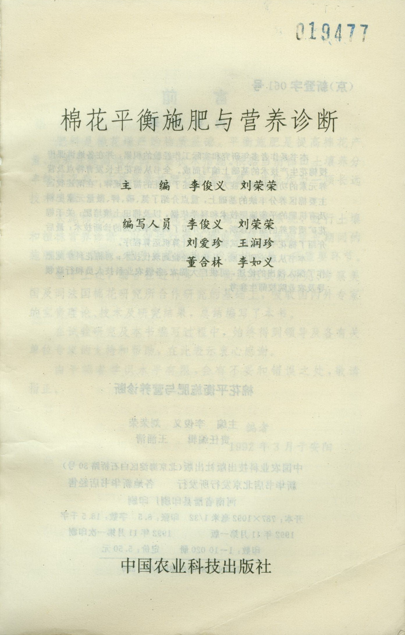 鉴于上述,编者在进行多年平衡施肥试验研究、考察美国及同法国棉花研究所合作研究的基础上,吸取国内外专家的宝贵理论、技术及研究结果,总结编写了本书。