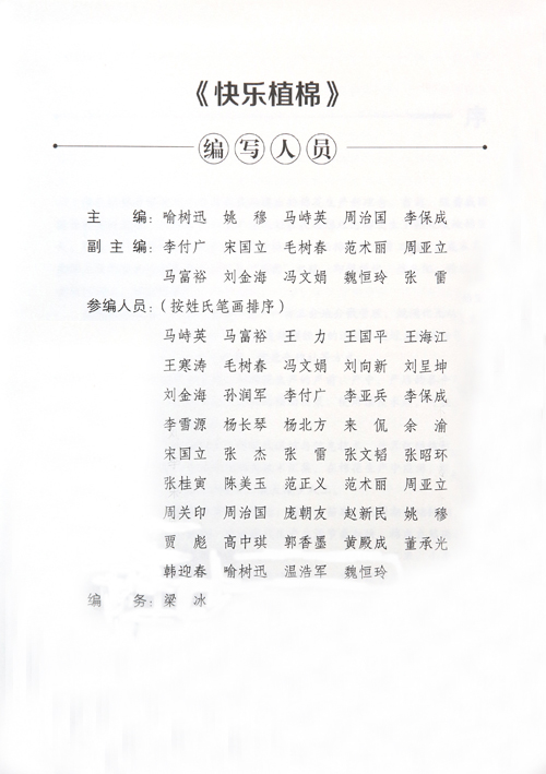 • 编著者 主编:喻树迅等;副主编:李付广、宋国立、毛树春、范术丽、刘金海、冯文娟、魏恒玲、张雷等;参编人员:王国平、王寒涛、毛树春、冯文娟、刘金海、李付广、李亚兵、杨北方、宋国立、张雷、范正义、范术丽、周关印、庞朝友、郭香墨、黄殿成、韩迎春、喻树迅、魏恒玲等;编务:梁冰