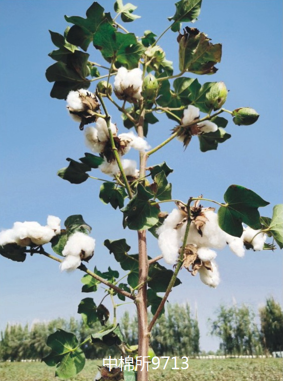 特征特性:转单价抗虫基因杂交春棉品种,生育期106天~112天。植株塔型,较紧凑,株高109.2cm~112.6cm;叶片掌状,中等大小,叶色绿,皱折明显,缺刻较深;结铃性较强,铃卵圆形偏大,铃嘴钝 ;第一果枝节位6.2节~6.7节,单株果枝数12.9个~15.1个,单株结铃16.3个~19.2个,铃重6.1g~7.0g,衣分40.0%~40.8%,籽指10.9g~11.4g,霜前花率93.1%~97.3%;吐絮畅而集中,易收摘,纤维色泽洁白。
