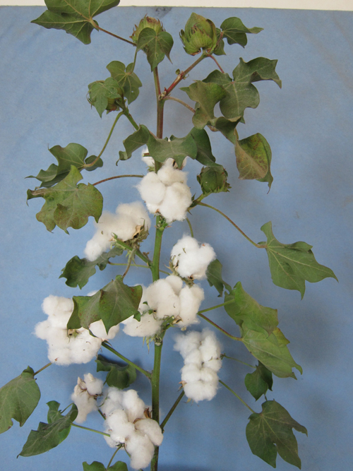 特征特性:陆地棉,株型呈筒型。株高68.8厘米,茎秆粗壮、有茸毛。果枝Ⅰ-Ⅱ式,叶色深绿,缺刻深。第一果枝着生节位5.2,果枝层数7.9层,单株结铃6.6个,铃卵圆形,单铃重5.6克,衣分42.5%,子指10.2克。纤维长度30.0毫米,整齐度指数87.1%,断裂比强度30.8cN/tex,麦克隆值4.1。生育期145天,霜前花率85.1%。抗病性,经自然病圃鉴定,抗枯萎病。