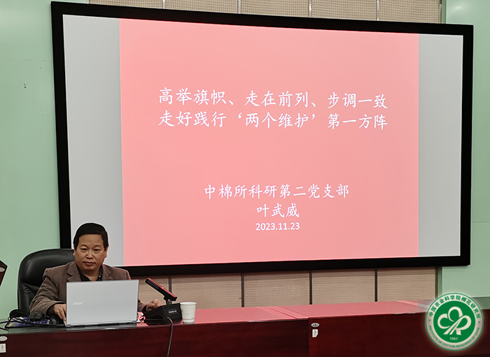 会上,科研第二党支部书记叶武威同志以“高举旗帜、走在前列、步调一致、走好践行‘两个维护’第一方阵”为题给支部党员讲党课,带领大家重温了中国共产党的光辉历程,传承红色基因,赓续精神血脉,接受心灵洗礼,汲取继续前行的智慧和力量,教育引导支部党员不忘初心跟党走,团结奋进新征程;介绍了中棉所在棉花科研上的辉煌成就和重大贡献,阐明了作为棉花科研国家队的一员,在新时代新征程上的光荣使命与责任担当,激励大家要强化思想引领,扛起政治责任,立足本职岗位,勇于创新,担当作为,用实际工作成效谱写棉花科技新的时代凯歌。