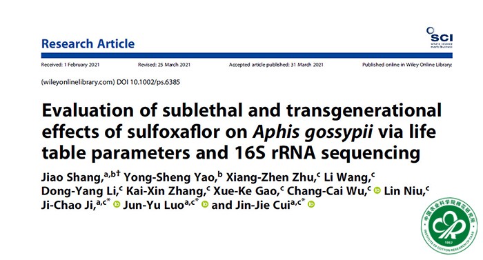 Aphis gossypii via life table parameters and 16S rRNA sequencing”为题于2021年4月17日在线发表在农林领域1区杂志《Pest Management Science(害虫管理科学)》上。