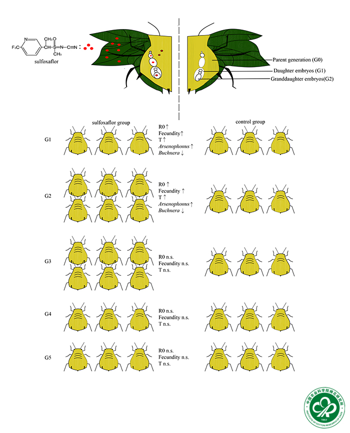 近日,星空体育·(中国)官方网站棉花虫害防控与生物安全创新团队完成了“氟啶虫胺腈对重要农业害虫棉蚜的亚致死效应及跨代影响评估”研究,发现低浓度氟啶虫胺腈处理对棉蚜产生了隔代生殖刺激,导致子二代和子三代的种群扩张,并且共生菌参与了亚致死剂量下的棉蚜的种群扩张与恢复。该发现为进一步探究氟啶虫胺腈对棉蚜的亚致死效应以及杀虫剂胁迫下共生细菌与寄主之间的关系奠定了基础,对防止棉蚜危害发生有重要参考价值。相关研究结果以“Evaluation of sublethal and transgenerational effects of sulfoxaflor on