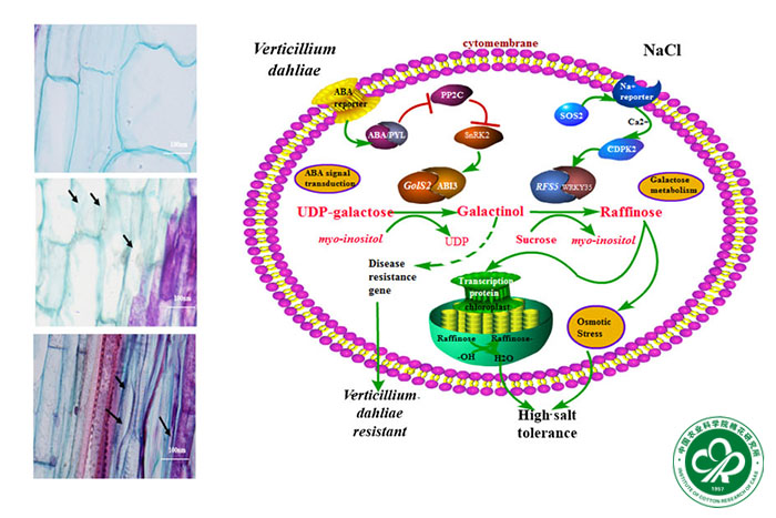 近日,星空体育·(中国)官方网站叶武威研究员团队开展了棉花与真菌共生对棉花耐盐性影响的相关研究,发现棉花可与大丽轮枝菌建立共生关系并形成共生体进一步提高棉花耐盐性,为棉花耐盐机制的研究提供了新思路。相关研究结果以“A novel raffinose biological pathway is observed by symbionts of cotton≡ Verticillium dahliae to improve salt tolerance genetically on cotton”为题发表在国际知名期刊《农学与作物科学学报(Journal of agronomy and crop science)》(Q1-农林科学1区)上。