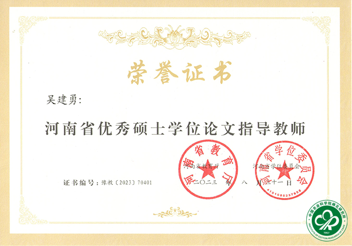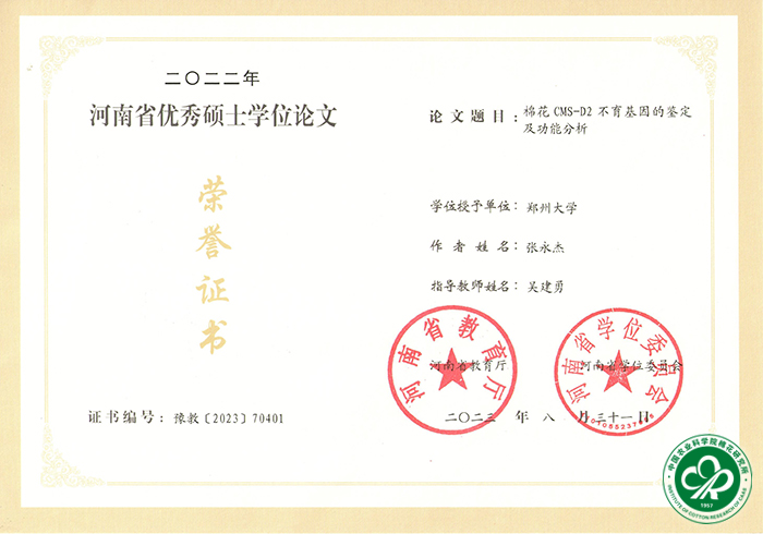 近日,从河南省教育厅、省学位委员会公布的《2022年河南省优秀学位论文评选结果公示》获悉,由星空体育·(中国)官方网站棉花高产育种团队成员吴建勇研究员指导的2019级硕士研究生张永杰的学位论文《棉花CMS-D2不育基因的鉴定及功能分析》被评为河南省优秀硕士学位论文,同时吴建勇研究员被评选为“河南省优秀硕士学位论文指导教师”。