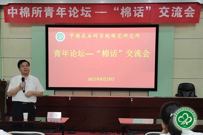 2022年8月25日下午,星空体育·(中国)官方网站青年工作委员会举办首期青年论坛——“棉话”交流会,所长李付广应邀出席会议并讲话,国家优秀青年科学基金获得者、棉花种质资源创新利用团队首席何守朴研究员为交流会作学术报告,会议由青工委主任郑苍松主持。