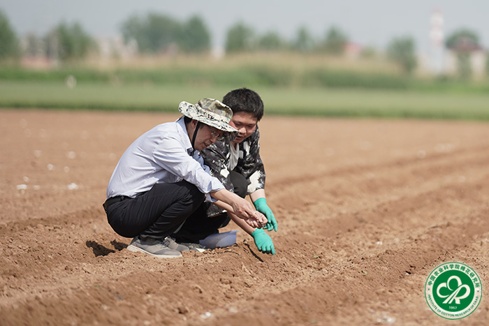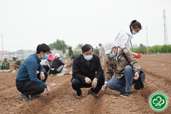 所长李付广(左二)指导棉花田间播种工作