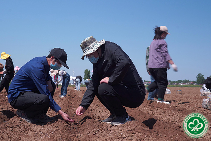 党委副书记、纪委书记宋国立(左一)讲解棉花播种要点