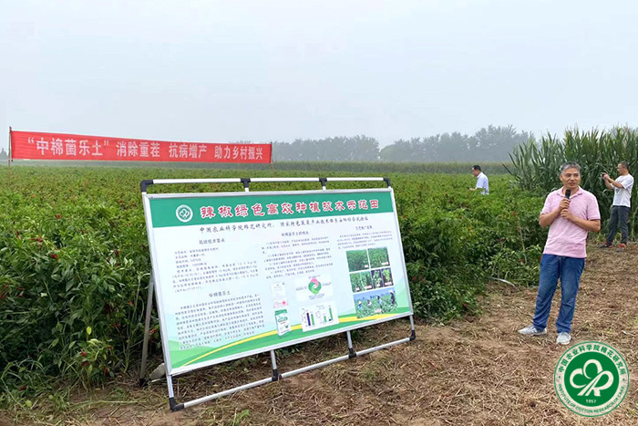 观摩会上,国家特色蔬菜产业技术体系安阳试验站站长马文全研究员表示,辣椒是我国种植面积最大的蔬菜,全国种植面积为3200万亩左右,安阳市辣椒种植面积50万亩左右,是农民增收致富的重要特色产业。但随着种植年限的增加,辣椒连作障碍问题突显,土传病害发生加重,严重限制该产业的可持续发展。因此,加强技术创新,解决连作障碍是辣椒产业发展亟须解决的问题。中棉所冯自力副研究员介绍了“中棉菌乐土”在安阳县后白壁村辣椒上的试验示范情况。