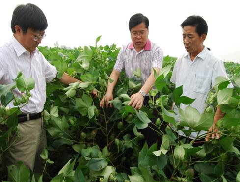 图二:中国农科院棉花研究所副所长李付广(中)、研究员袁有禄(左一),在河北邯郸市科技局领导陪同下考察中棉所60棉花试种示范基地。程天赐 摄