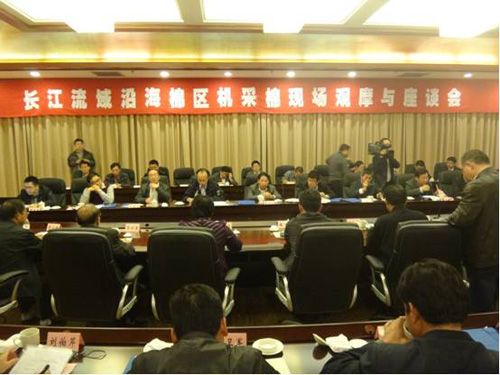 为推进长江流域沿海棉区棉花生产机械化进程,在国家棉花产业技术体系、江苏省农业三新工程和江苏省农业科技自主创新项目的支持下,江苏作物学会棉花专业委员会组织南京农业大学、江苏省农科院、扬州大学、江苏省农委等“三农四方”,以实现棉花高产优质增效为目标,以轻简化和机械化为关键内容,着力于农艺农机融合为主导的科技创新和棉花机械化轻简高效现代栽培技术的应用。经过近一年的准备11月4日在大丰召开“长江流域沿海棉区机采棉现场观摩与座谈会”。