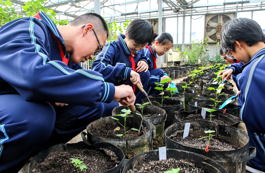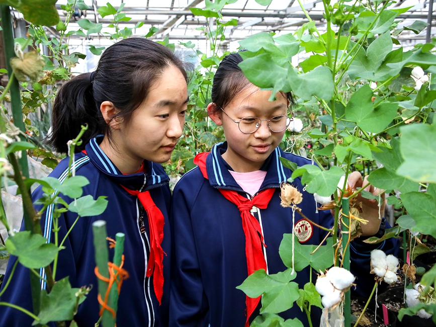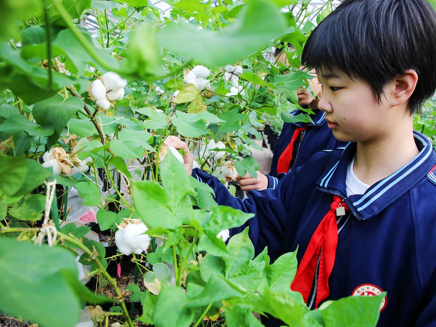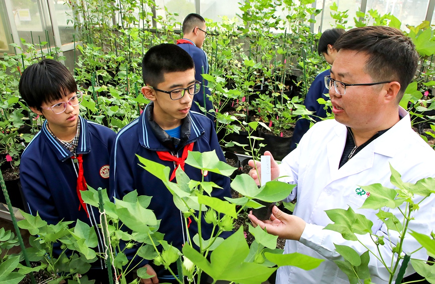 河南省安阳市文峰区第五中学,学生在中国棉花研究所温室大棚内进行社会实践活动。麻翛然摄