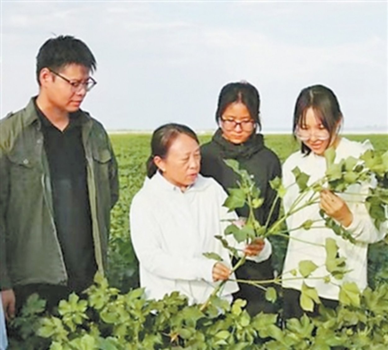 新疆的棉花快丰收了。这段时间,宋美珍(见图左二,中国农科院西部农业研究中心供图)和团队马不停蹄走访棉农,调查不同棉花品种的收成情况。