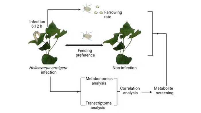 该研究基于“棉花-棉蚜-棉铃虫”的生态关系,利用生物学、生态学和组学技术,从不同层面解析棉花介导的棉铃虫和棉蚜的种间关系。通过棉铃虫为害棉花后对棉蚜取食行为和种群影响的分析,发现棉铃虫为害棉花后对棉蚜种群具有显著抑制作用,表明棉铃虫为害棉花后可能通过激发植物抗性防御对低耐受力的棉蚜产生影响。通过转录组学和代谢组学分析及代谢物的筛选,证实棉铃虫通过调控植物次级代谢物变化,抑制棉蚜的生长发育并导致棉蚜逃避。研究结果阐明棉铃虫与棉蚜之间的相互作用关系,为科学制定害虫生态防控策略及生物源代谢物的开发应用奠定理论依据。