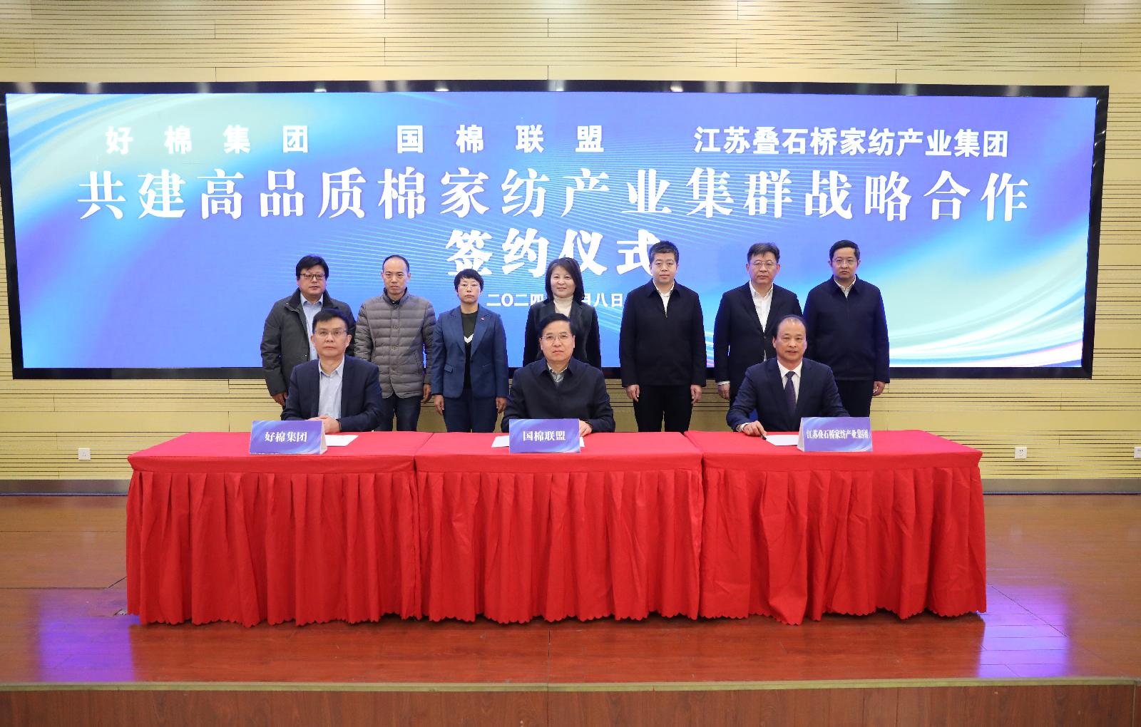 为快速高效推进落实双方合作相关事宜,会上,国家棉花产业联盟实体化运行机构——海南好棉科技集团有限公司与海门区所属国有企业——江苏叠石桥家纺产业集团签署了具体合作协议,同时,举行了“国家棉花产业联盟江苏运营区域总部筹建办公室”揭牌仪式。