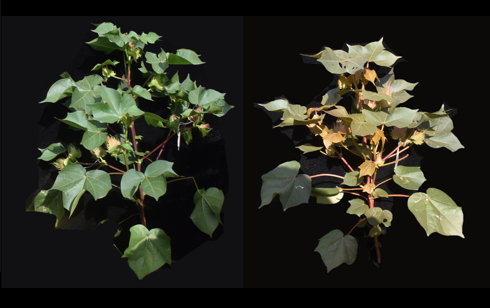 富含虾青素的工程棉花(右)与普通棉花(左)。中国农科院棉花所供图