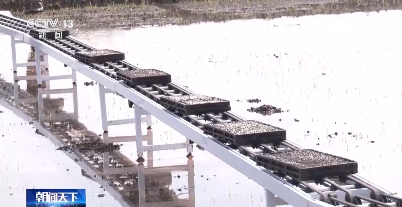 不仅育苗环节智能化,在四川丹棱的稻田里,今年新上的秧盘智能传输带也派上了大用场。传输带把育秧车间长出嫩芽的育秧盘运送到田间,通过补土、施肥、覆膜,轻松完成秧苗移栽。