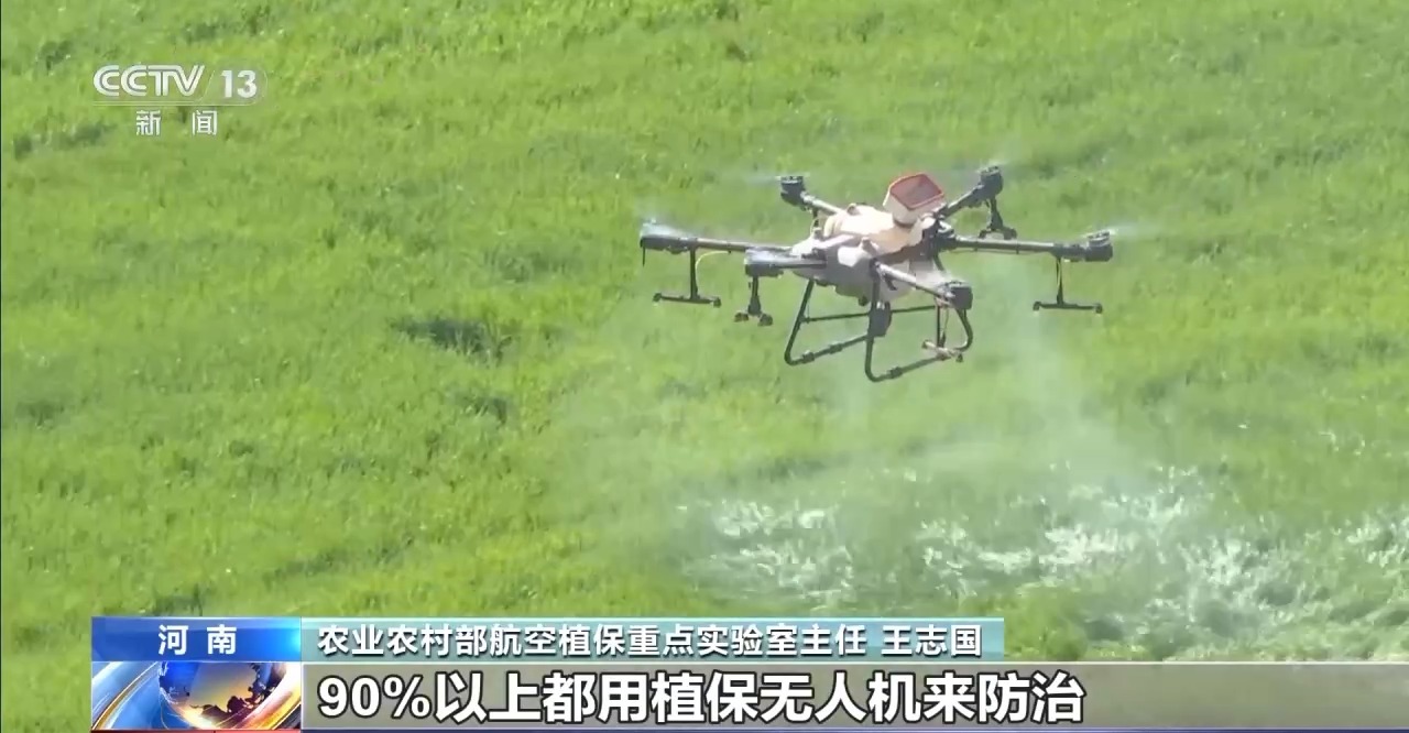 农业农村部航空植保重点实验室主任 王志国:目前,小麦病虫害90%以上都用植保无人机来防治,一台无人机一天可防治1000亩地,能顶替100个劳动力,而且不重喷,不漏喷,非常精准。