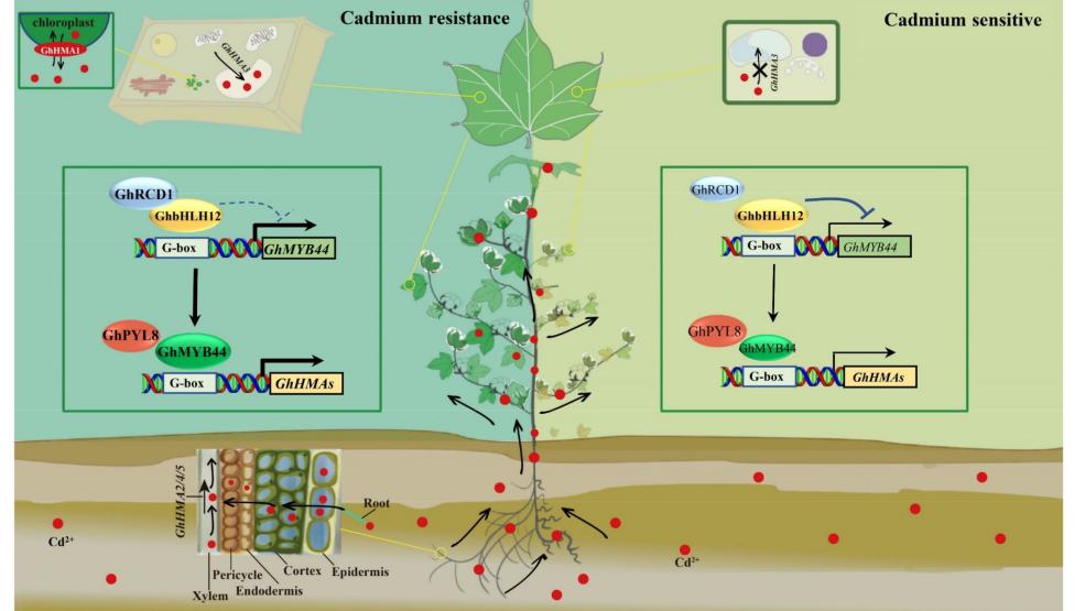 该研究在棉花中鉴定到对重金属镉敏感基因的插入突变体,发现该基因通过调控三个蛋白之间的转录级联来响应镉胁迫,并且整合氧化胁迫通路和脱落酸通路,进而调控下游基因的表达,增加了镉向液泡中的转移,增强了镉从根部向地上部的转运,从而提高了棉花对镉胁迫的耐受性。研究结果为培育耐镉棉花品种提供了优异基因和种质材料,拓展了棉花在治理土壤重金属污染方面的应用。