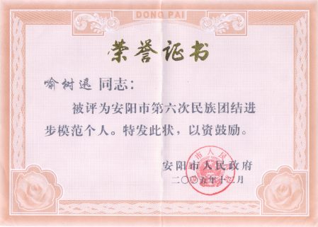 所长喻树迅被评为安阳市第六次民族团结进步模范个人