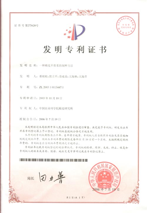 以棉花所研究员邢朝柱博士为主的研究课题组完成的“一种棉花不育系的制种方法”日前获得国家发明专利。 该发明是以抗虫双隐性不育系中抗A为基础材料,通过回交转育法培育出带有无腺体标记性状的抗虫不育系, 该不育系恢复源广泛,一般陆地棉品种(系)均可作为其恢复系,杂交优势明显;发明中还利用该不育系为母本, 抗虫品种为父本,蜜蜂作为传粉媒介,经过多年研究,系统地提出了父母本最佳种植比例、种植方式以及不同气候 因素下采取的措施等制种体系。该制种体系可大大减少制种田的劳动强度,比一般杂交棉制种减少60%以上的用工; 生产出的杂交种很容易区别真假,而且在苗床上即可轻易拔除,可以大面积、大规模地借助昆虫辅助传粉进行田间制种。