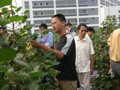 代表们先后观摩了长江中棉棉花新品种“大王株”展示区、杂交棉高产展示田、品种比较试验田,并对中棉所最新育成的系列抗虫杂交棉新品种及高产展示给予一致好评。高产型中棉所53、中棉所62、中001,平均单株结铃50.2~59.1个,预计亩产籽棉364.0~431.9公斤,尤其中棉所53表现结铃性强、铃大小适中、衣分高、吐絮畅,已被列为安徽省2007年棉花良种推广补贴品种;大铃型中棉所55、中棉所48平均单株成铃43.4~56.4个,铃重分别可达6.3克和7.3克,预计亩产籽棉368.9~447.7公斤。