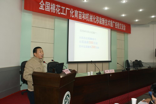 国家棉花产业技术体系首席科学家、我所喻树迅所长出席会议并讲话。他对各位代表积极推广应用新技术取得的成绩表示衷心感谢,对应用基质育苗技术创立综合种苗基地发展形成的通用技术给予充分肯定,对应用“两化”新技术推进耕作制度改革,两熟北移两纬度、以及创高产取得的新进展给予高度评价。