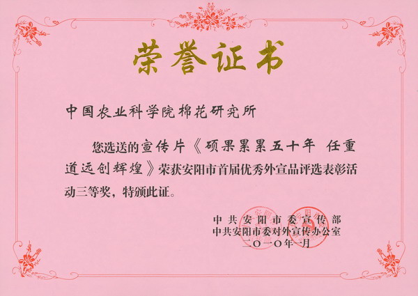 近日,由我所选送的宣传片《硕果累累五十年 任重道远创辉煌》在安阳市首届优秀外宣品评选表彰活动中荣获三等奖。