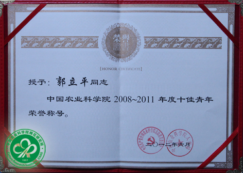 根据中国农业科学院直属机关党委、中国农业科学院人事局文件《关于表彰2008~2011年度中国农业科学院“十佳青年”和“青年文明号”的决定》(直党字〔2012〕18号),因业绩突出,我所育种室副研究员郭立平荣获2008~2011年度中国农业科学院“十佳青年”荣誉称号。 全所广大青年应向先进学习,立足岗位创先争优,为我所科研事业做出新的贡献。