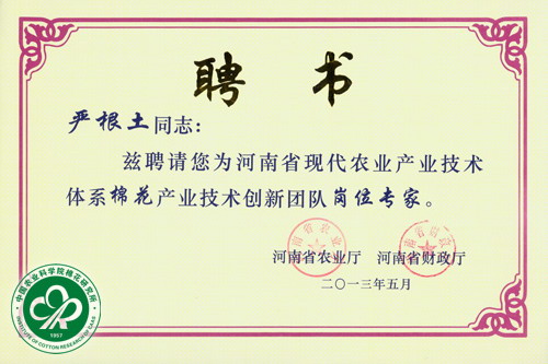 严根土副研究员被聘为河南省棉花产业技术创新团队岗位专家