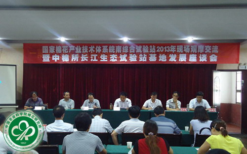 会议由国家棉花产业技术体系皖南综合试验站站长周晓箭副研究员主持。望江县副县长曹晓革和我所张西岭处长分别致欢迎词。会议主要就皖南棉区示范县2013年棉花高产示范情况、如何充分发挥皖南综合试验站功能和为棉区提供高质量的服务,以及中棉所长江生态试验站基地发展规划、进一步加强基地与地方协作等问题进行了交流探讨。期间,与会人员听取了安徽省农科院棉花研究所所长路曦结研究员和浙江大学王学德教授的学术报告,并到皖南综合试验站棉花高产示范基地进行了现场观摩。