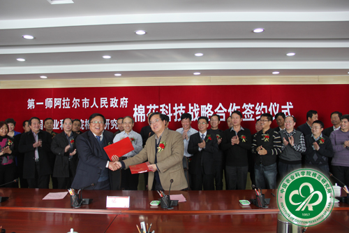 2014年1月21日,我所与新疆生产建设兵团第一师阿拉尔市人民政府在阿拉尔市举行棉花科技战略合作协议签约仪式。中国农业科学院副院长、中国工程院院士刘旭和我所党委书记、所长李付广及一师阿拉尔市党委副书记、师长、市长王新民出席签约仪式并致辞,中国农业科学院科技管理局科技平台处处长熊明民、我所副所长王坤波和一师阿拉尔市党委常委、副师长杨江勇等领导以及双方与会专家出席了签约仪式。李付广所长和杨江勇副师长分别代表双方在科技战略合作协议上签字。