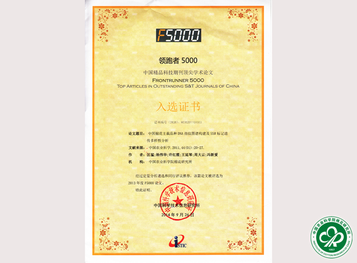 近日,科技部中国科学技术信息研究所公布了2013年度“领跑者5000—中国精品科技期刊顶尖学术论文(简称F5000)”,我所种子品质课题组匡猛博士等人2011年发表在《中国农业科学》上的学术论文《中国棉花主栽品种DNA指纹图谱构建及SSR标记遗传多样性分析》被收录。