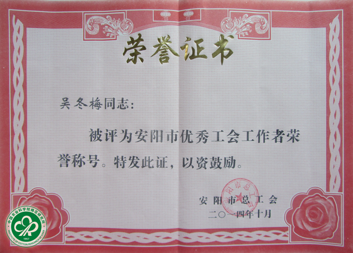 2014年11月5日,安阳市工会第十五次代表大会在安阳大会堂召开。会上,表彰了工会工作先进集体、先进个人和优秀工会之友。我所工会科研分会荣获“安阳市模范职工小家”称号,我所职工吴冬梅荣获“安阳市优秀工会工作者”称号。