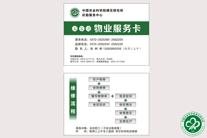 2014年12月24日,我所后勤服务中心物业科到石家沟家属区发放了物业服务卡。服务卡明确了服务流程和范围,物业科根据维修任务等情况,将安排人员每周三上午到石家沟进行维修。物业服务卡的发放将更好的为我所职工提供服务,进一步推动了后勤服务中心工作登上新的台阶。