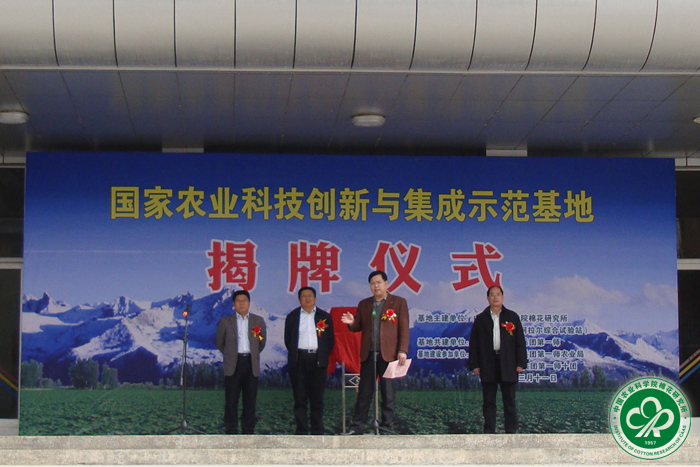 2015年3月11日下午,我所与新疆生产建设兵团第一师在我所阿拉尔综合试验站隆重举行了“国家农业科技创新与集成示范基地”揭牌仪式。我所所长、党委书记李付广和一师阿拉尔市党委常委、副师长杨江勇分别为“国家农业科技创新与集成示范基地”揭牌仪式致辞,双方共同揭牌。我所副所长王坤波及成果转化处、栽培研究室、新疆科研中心及第一师农业局、十团、八团、十三团等有关部门、单位负责人参加了揭牌仪式。为配合我所科研工作向新疆转移阿拉尔综合试验站于2014年1月在第一师十团成立,同年5月,经中国农科院推荐,被农业部列入全国百个“国家农业科技创新与集成示范”基地,该基地由我所主建、新疆生产建设兵团第一师及中棉种业科技股份有限公司作为共建单位参与基地建设。