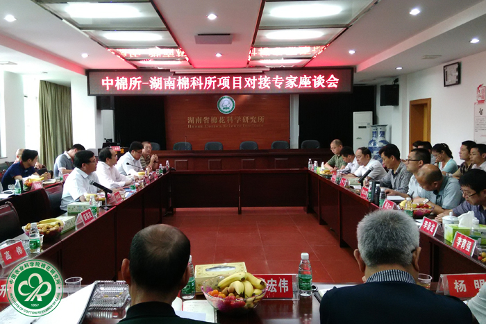湖南调研期间,在湖南省农业委员会总农艺师刘年喜及湖南棉花所所长李毅等人的陪同下,张西岭一行考察了该所茅弯试验基地,并出席湖南省农委主持的中棉所—湖南棉花所项目对接专家座谈会。会上,李毅就中棉所与湖南棉花所多年的科技合作情况及下一步合作建议做了详细报告。与会领导专家一致认为,湖南棉花所与中棉所有着长期友好的科研合作关系,双方信任度高,优势明显,多年来结下了深厚的友谊,并且取得了可喜的成果。张西岭在讲话中强调我所与湖南棉花所的合作应面向整个长江流域棉区,瞄准该棉区棉花生产中存在的重大问题,进行深度融合和开展更实质性的工作,特别是要探讨人的融合问题,逐步实现“你中有我、我中有你”的合作新机制。刘年喜在总结讲话时强调,中棉所与湖南棉花所更进一步开展实质性合作意义重大,湖南省农委将同中棉所一起共同探讨长江流域棉花科技合作事宜,并在条件成熟时组织湖南省有关单位同中棉所签订棉花科技全面合作协议,以在解决长江流域棉花生产与科技问题方面发挥更大作用。