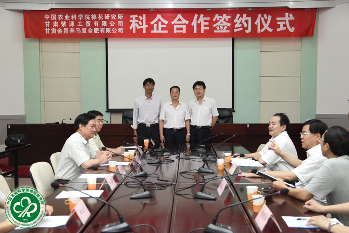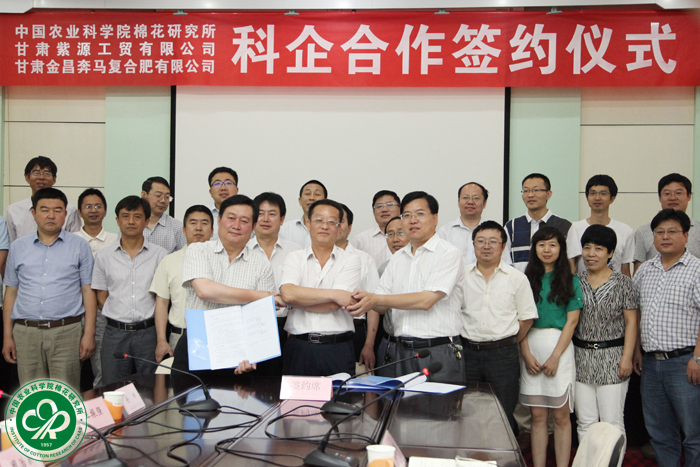 2015年6月19日,我所与甘肃紫源工贸有限公司、甘肃金昌奔马复合肥有限公司科企合作签约仪式在产业楼多功能厅举行。我所所长、党委书记李付广、紫源公司董事长李平章和奔马公司董事长周志新分别代表各方在《合作合同》上签字。签约仪式由副所长张西岭主持。
