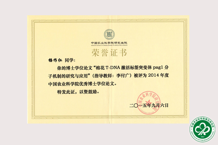 2015年9月6日,在我院举办的2015级研究生开学典礼暨表彰会上,我所杨作仁博士学位论文“棉花T-DNA激活标签突变体pag1分子机制的研究与应用”(指导老师:李付广)被评为2014年度中国农业科学院优秀博士论文,成为我所首次荣获此项奖励的博士论文。