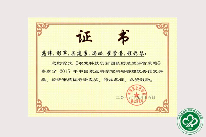 2015年9月15~16日,中国农科院科研管理工作会议在成都召开。会上传来喜讯,我所科技管理处高伟等撰写的论文《农业科技创新团队的绩效评价策略》获得2015年中国农科院科研管理优秀论文奖。