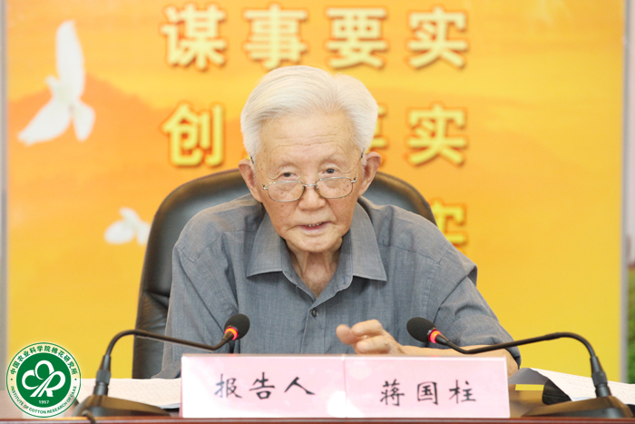 蒋国柱先生,1953年8月毕业于北京农业大学,我所栽培室原主任,是第一代中棉所人,见证了我所从选址、1957年建立直到今天的发展历程。蒋先生向与会人员讲述了自己少年时历经抗日战争和解放战争时期的坎坷求学岁月,以及陪同时任农业部副部长的杨显东带队缜密考察确定所址的故事。蒋先生以风趣幽默的语言讲述了建所初期与37位同事一起舍弃优越条件的北京,来到穷乡僻壤的安阳白璧艰苦创业的故事。在那样艰苦的条件下,蒋先生等第一代中棉所人心无旁骛,默默坚守在自己的科研岗位上,潜心研究,解决棉花科研难题,不断开拓创新,奠定了我所在棉花科研领域的重要地位。蒋先生以亲身经历殷切希望我所科研人员能深入实际、深入生产一线搞科研,这样才能抓住关键性的问题,提出解决办法,才能出人才、出成果、为生产服务。