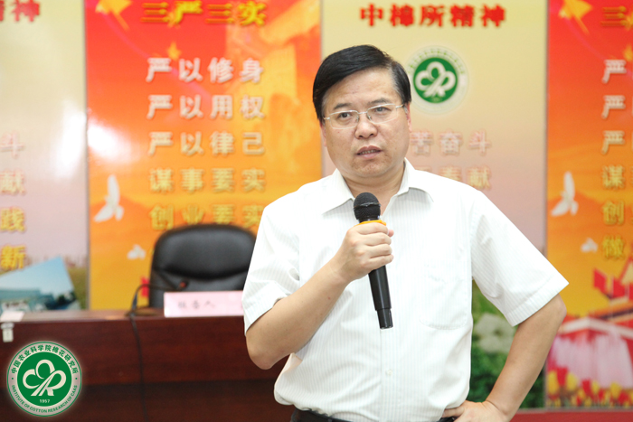 所长李付广致欢迎词,他表示,正是一代代中棉所人默默地拼搏着、奉献着、耕耘着,才使我所有了各项突破,有了如今的发展,使得中棉所精神得到社会各界的广泛关注,我所干部职工要向蒋国柱先生等第一代中棉所人学习,发扬“筚路蓝缕、以启山林”的创业精神,勿忘当年的艰苦岁月,让中棉所精神薪火相传。李付广要求,我所干部职工要恪守习近平总书记提出的“三严三实”要求,加强自身修养,以优良作风,推动各项工作取得新发展。