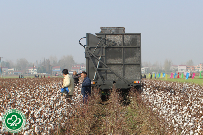 与会人员重点考察了麦后直播示范田棉花品种的结铃吐絮情况,听取了技术人员关于种植栽培模式及采棉机性能的介绍,并现场观摩了利用农业部南京农业机械化研究所设计的指秆式采棉机和江苏正工采棉机有限公司生产的摘锭式采棉机进行机械化采收的试验示范。示范观摩点位于湖北沙洋县马良镇北港村,试验品种包括中棉所50、中190和华棉3109,麦收后于6月10日直播。行株距为76cm×15cm,分别于6月20日、7月26日、8月24日和9月16日进行了4次化调,10月8日喷施催熟脱叶剂。