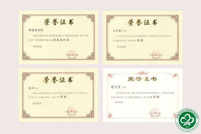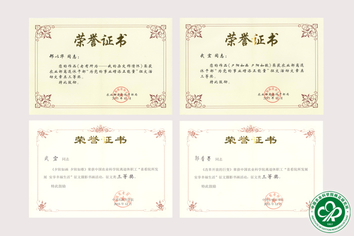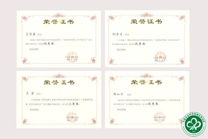 在我院举行的活动中,刘刚的作品《组图—见证棉花所发展变化》、王秀林的作品《东方红》均荣获摄影类一等奖;胡育昌的作品《忆中棉所巨变》、郭香墨的作品《改革开放的巨变》分别荣获征文类二、三等奖;武宏的作品《夕阳如画 夕阳如歌》、邢以华的作品《老有所为—我的杂交棉情怀》分别荣获征文类三等奖、优秀奖;胡斌的作品《廉政》、夏俊英的作品《春艳》、刘金生的作品《全家福》分别荣获书法类、绘画类优秀奖。同时,邢以华、武宏的作品在农业部举行的活动中荣均荣获三等奖。