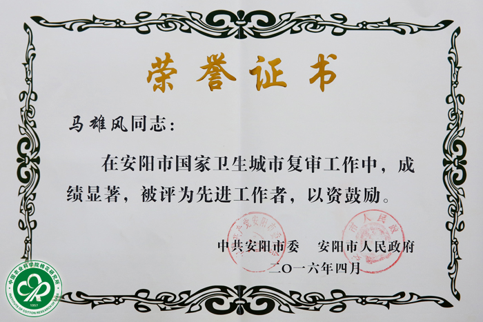 安阳市开展创卫复审工作期间,马雄风带领同事,按照市委、市政府及所党委的统一安排和部署,精心组织、认真策划,确保了我所创卫复审工作的顺利开展。先后组织单位职工500余人次利用周末休息时间上路义务劳动,积极配合相关部门迎接检查,开展了一系列爱国卫生及健康教育活动,取得了突出成绩,获得了上级领导的好评,在安阳市顺利通过国家卫生城市复审工作中,做出了突出贡献。