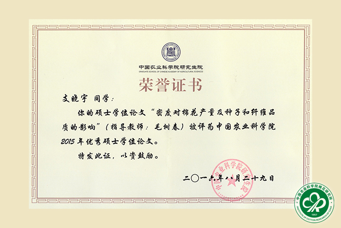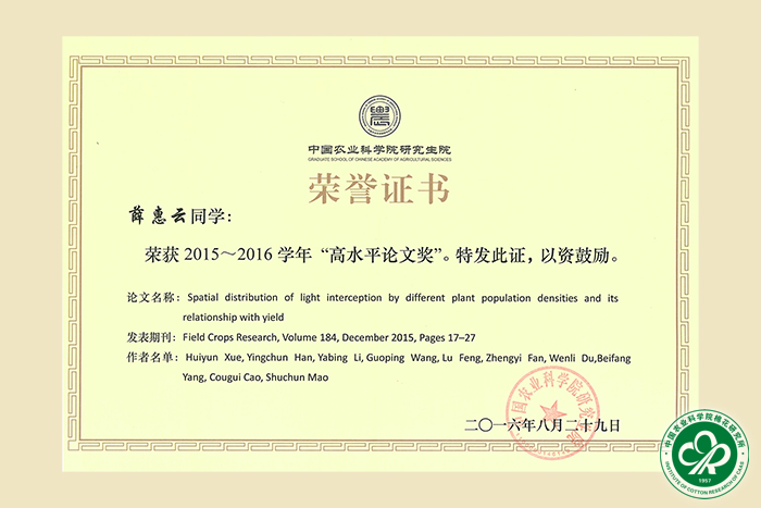 2016年9月1日,从中国农科院研究生院2016级开学典礼上传来喜讯,由我所轻简化植棉团队毛树春研究员指导的2016届博士毕业生薛惠云的论文“Spatial distribution of light interception by different plant population densities and its relationship with yield”荣获2015~2016学年“高水平论文奖”。同时,由其指导的2015届硕士毕业生支晓宇的硕士学位论文《密度对棉花产量及种子和纤维品质的影响》被评为“中国农业科学院2015年优秀硕士学位论文”。