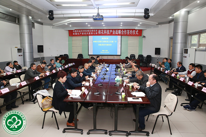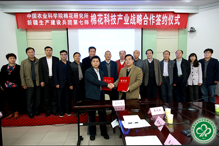 2016年10月26日,我所在产业楼多功能厅举行与新疆生产建设兵团第七师的棉花科技产业战略合作签约仪式。所长、党委书记李付广与七师党委书记、政委王光强代表双方在协议书上签字。副所长张西岭主持签约仪式。